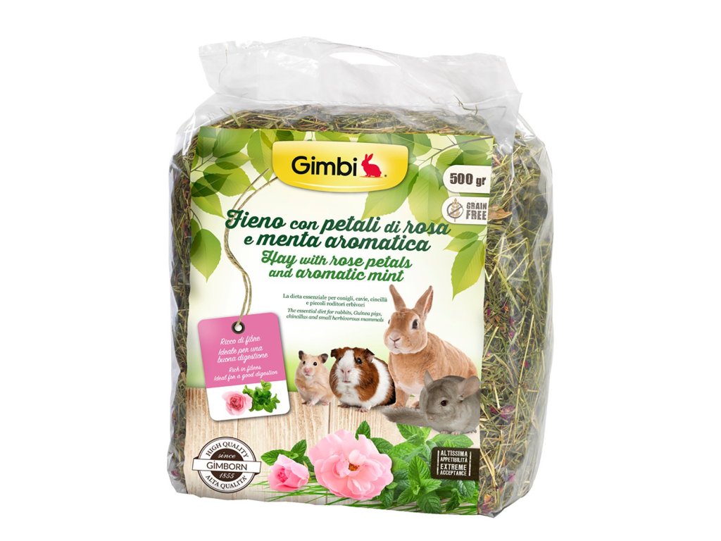 Gimborn IT GIMBI krmné seno s růžíKvalitní krmné seno s obsahem růžových květů a máty je perfektním doplňkem stravy pro všechny býložravé domácí mazlíčky, jako jsou zejména králíci, morčata a další druhy hlodavců. Seno obsahuje velké množství hrubé vlákniny, podporuje žvýkací reflex a napomáhá vylučování spolykaných chlupů. Gimborn seno je zpracováno šetrným sušením. Růže a máta peprná podporují zdravé trávení.