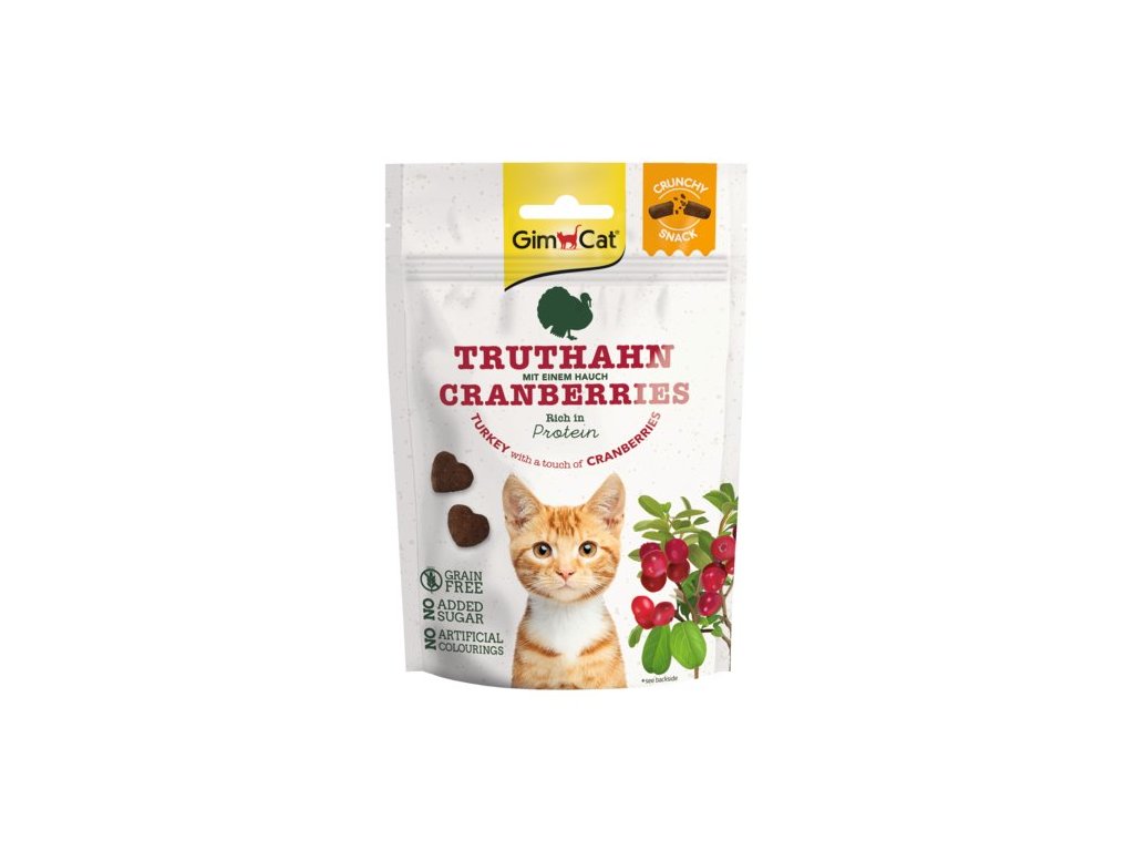 Gimcat Crunchy Snacks Krocan s brusinkami 50gChutná receptura, složení bohaté na bílkoviny, bez přidaného cukru a umělých aromat a bez obilovin. Pamlsky jsou vhodné i pro alergické kočky.