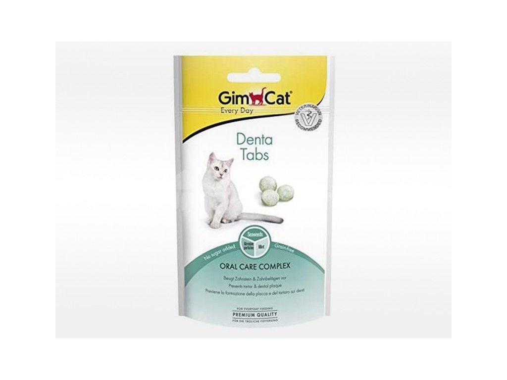 GimCat Denta Tabs 40 gGimcat Denta Tabs jsou dentální tablety určené pro kočky všech velikostí a plemen. Obsahují cenná čisticí tělíska z celulózy, která pomáhají odstraňovat zubní povlak a hexafosfát sodný zamezující tvorbě zubního kamene. Mořské řasy vedle toho posilují zuby a máta zlepšuje dech. Tablety jsou bez přidaných cukrů a obilovin.