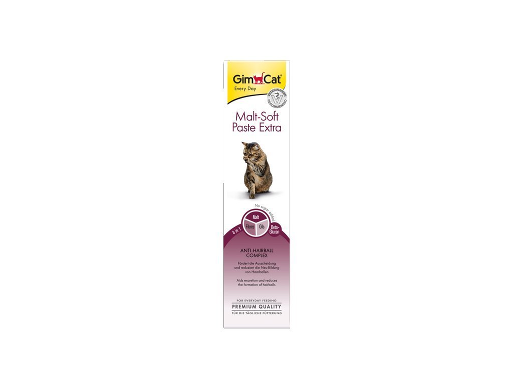Gimcat Malt-Soft Extra pasta pro kočky.Speciální pasta určená k podpoře vylučování spolknutých chlupů a zároveň bránící vytváření chuchvalců v žaludku, s extra obsahem vlákniny. Gimcat Malt-Soft Extra s vylepšenou recepturou obsahuje přírodní aromatizovanou maltózu, speciální rostlinný olej a mléčně-cukerný derivát s vysokým obsahem TGOS. Výchozí složkou při výrobě tohoto produktu je mléko a bez přidaného cukru.