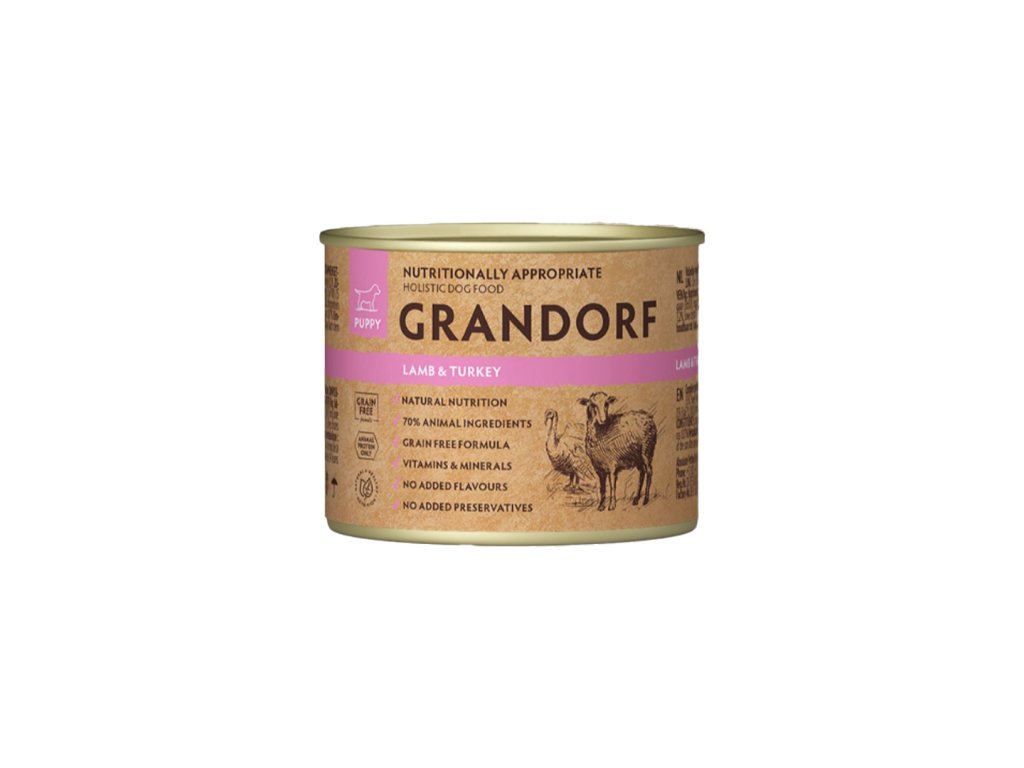 Malý čumáček, velká dobrota! Jemné jehněčí a krocan pro štěňátka plná radosti a energie!Kompletní hypoalergenní holistické krmivo pro štěňata všech plemen od 14 týdnů věku. Ideální pro štěňátka s citlivým trávením nebo se sklonem k alergiím. Mokrým krmivem Grandorf dopřejete svým mazlíčkům pestrou a chutnou stravu.