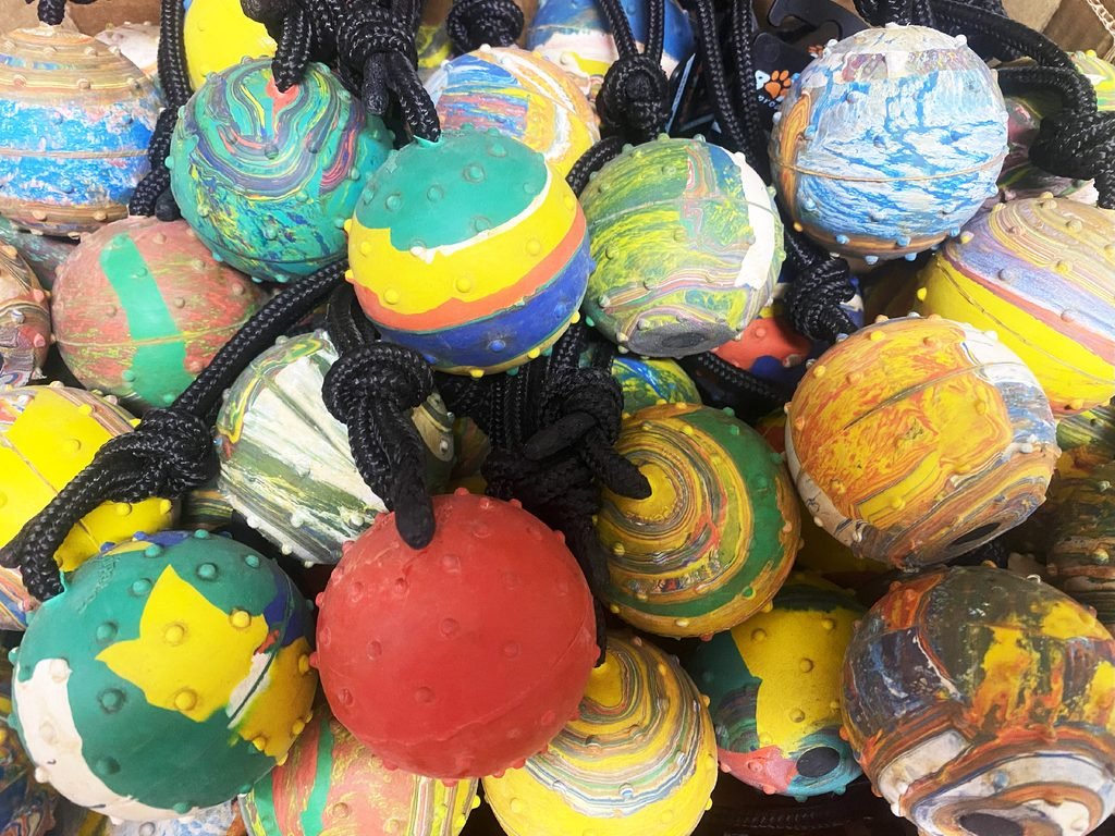 Míček je vyroben z tvrdé tvrzené gumy, která odolá i intenzivnímu žvýkání a přetahování. Je připevněn na pevné nylonové šňůrce pro snadnou manipulaci a lepší motivaci psa při výcviku nebo hře.