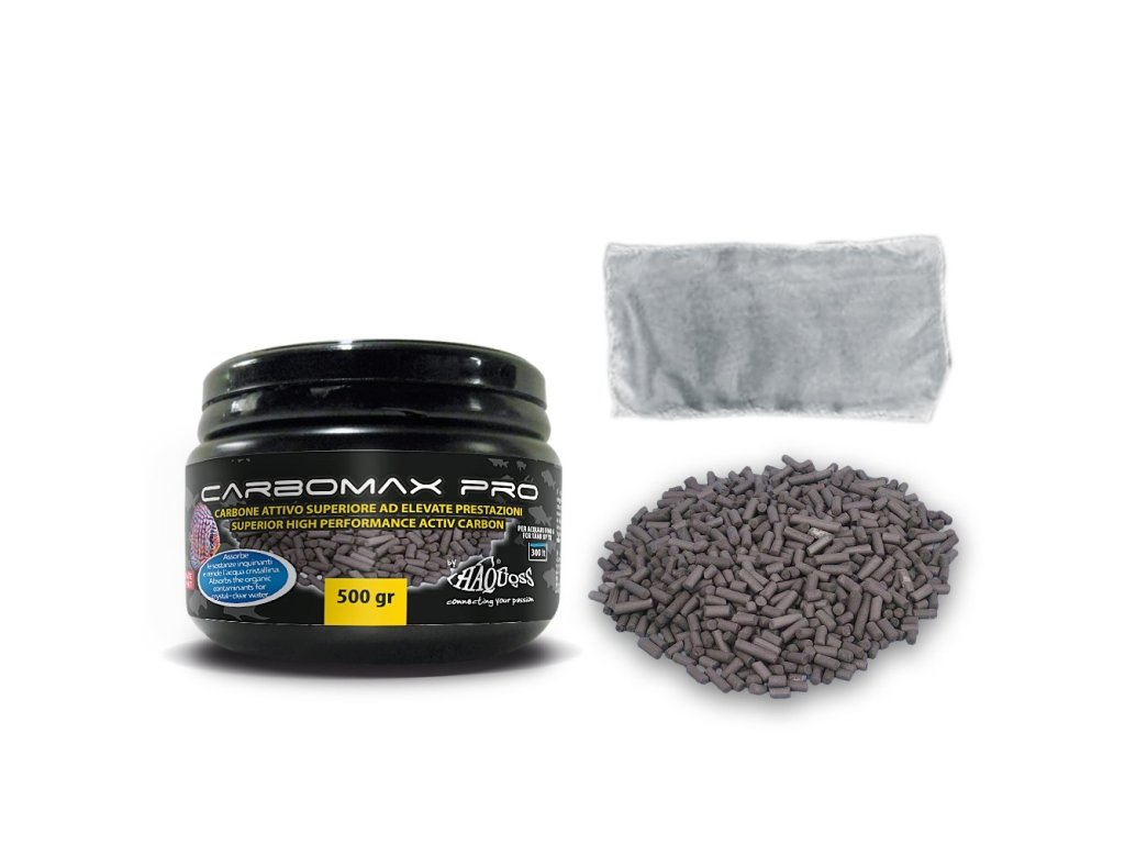 Haquoss CARBOMAX PRO 500 gPelety pro čištění mořských a sladkovodních akvárií. Vyrobeny z aktivního uhlí rostlinného původu, mechanicky lisované. Hustota materiálu zaručuje vysokou úroveň filtrace.