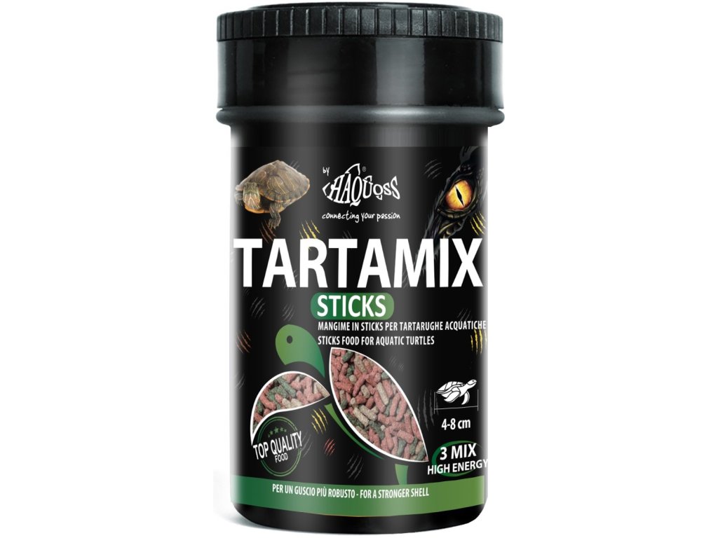 Haquoss kompletní krmivo pro želvyS prémiovým krmivem Haquoss dodáváte svým želvám všechny důležité živiny. Tyčinkové krmivo je vhodné pro vodní i suchozemské želvy. Jedná se o směs, která obsahuje všechny důležité živiny a přísun základních vitaminů, které zajišťují optimální poměr vápníku a fosforu pro zdravý krunýř a stabilní kosti. Granule jsou chutné a lehce stravitelné, což zajišťuje lepší kvalitu vody.