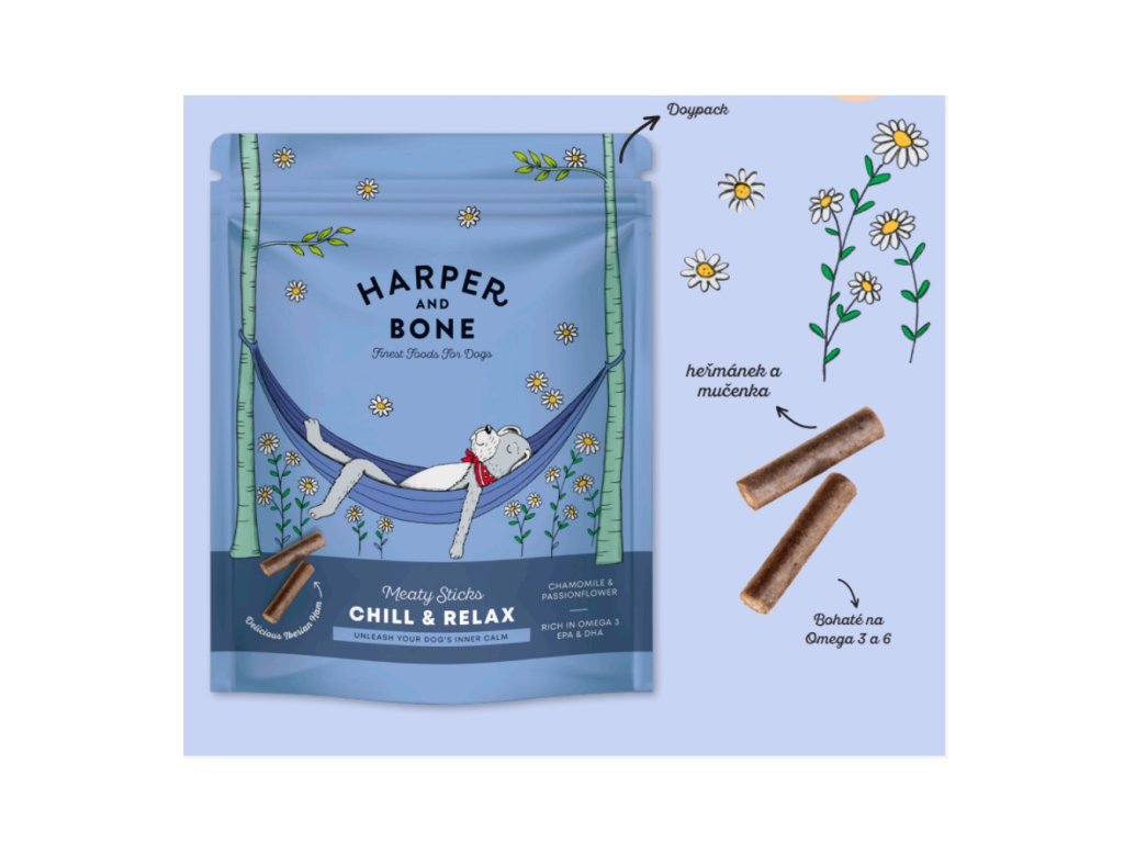 Harper and Bone Meaty sticks Chill & relax navíc obsahuje EPA a DHA, což jsou důležité omega-3 mastné kyseliny pro zdraví mozku a srdečního systému.