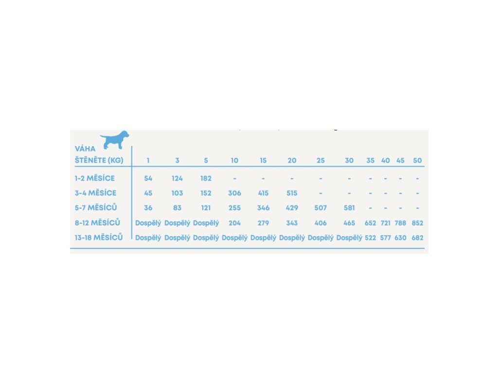 Krmný návod: změnu krmiva je třeba provádět postupně po dobu 7 dní. Po odstavení krmte 4 x až 5 x za den. Do 4 měsíců věku smícháním s teplou vodou v poměru 1 díl vody a 3 díly krmiva. Odstraňte zbytky krmiva. Štěněti okolo 1 roku postupně snižujte počet krmných dávek až na 2 za den. Pes musí mít vždy přístup k čisté, čerstvé vodě. Skladování: skladujte na chladném a suchém místě. Obal by měl být po použití vždy bezpečně uzavřen.