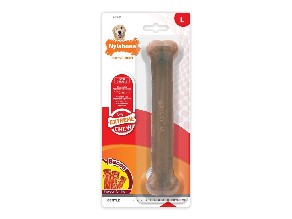 Nylabone hračka Extreme kost příchuť slanina LSlanina dělá všechno lepší! Tato hračka byla vyrobena z pevného a odolného nylonu s ohledem na silné čelisti vašeho psa. Řada kostí a žvýkacích hraček Nylabone Extreme je přesně to pravé pro vašeho psa, který rád žvýká a je v tom velmi dobrý. Tyto žvýkací hračky mají po celé délce lahodnou příchuť slaniny, což znamená, že příchuť vydrží po celou dobu žvýkání, příchutě nejsou na materiálu nijak nastříkané, namáčené ani potažené, a tak nehrozí, že by se tato chutná příchuť slízala. Materiál hračky je podobně tvrdý jako u skutečné kosti, ale nehrozí u něj takové nebezpečí. Výrobní proces jako žádný jiný, dbáme na to, aby se hračky netříštily. Místo toho se při žvýkání zdrsňuje jejich příjemný hladký povrch a na kosti se zvedají drobné štětinky, které pomáhají udržovat zuby vašeho štěněte čisté a zabraňuje tvorbě zubního kamene.