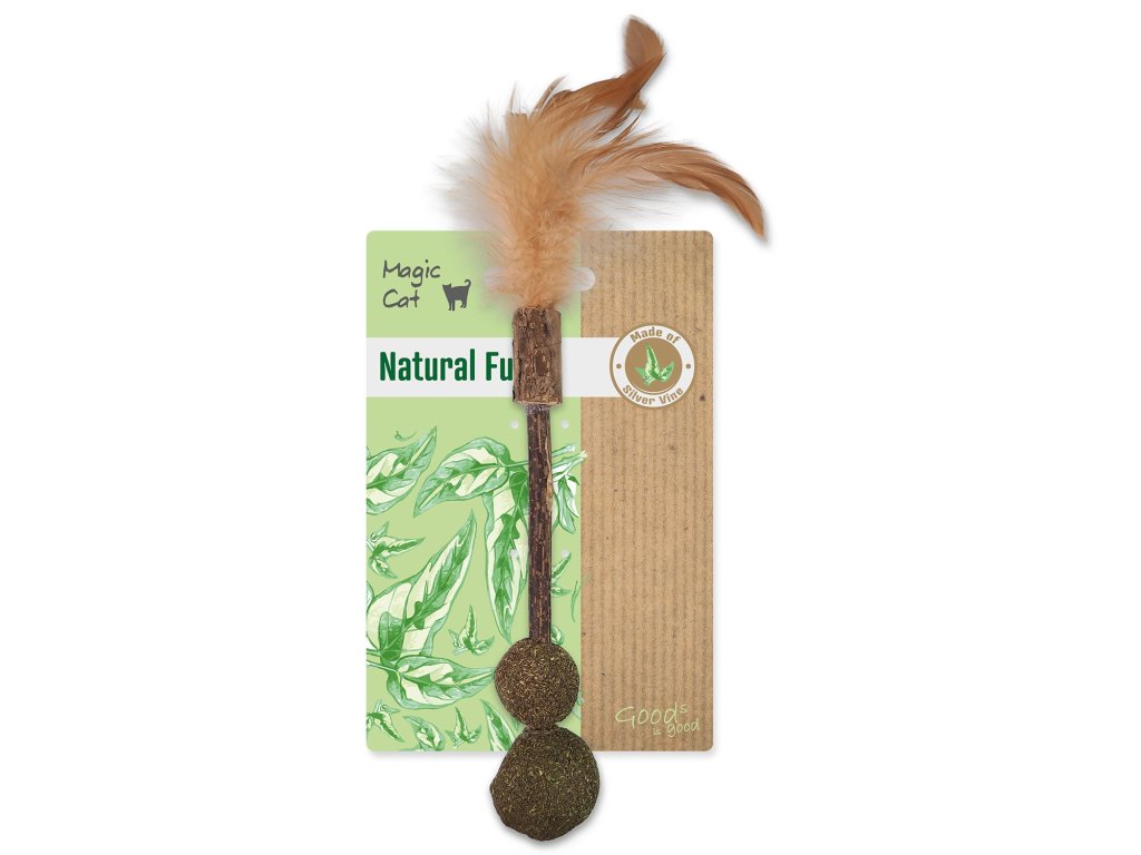 Hračka Magic Cat Natural Fun dřívko s přírodními pírky a zelenými koulemi 18cm
