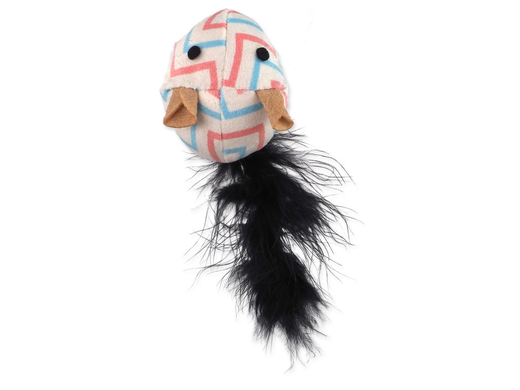 Lákavá hračka v podobě myši s pírkem a šantou kočičí.