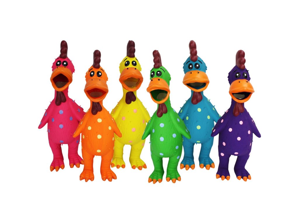 Velký latexový kohout v různých barvách s atraktivním pískavým zvukem. Po stlačení vydává "kejhající" zvuk. Materiál latex. Velikost 29 cm. Pro psy středních a velkých plemen. Uvedená cena za 1 ks. Dodáváno v různých barvách.Doplňkové parametry