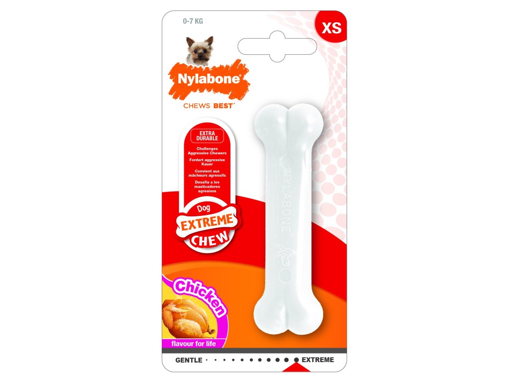 Hračka NYLABONE Extreme Chew Chicken XSNYLABONE Extreme Chew Chicken je oblíbená hračka ve tvaru kosti, která odolá silným zubům a navíc pomůže k jejich čištění. Hračka Nylab Extreme Chew Chicken je speciálně navržená pro psy se silným skusem. Hrbolky na hračce pomáhají čistit zuby a redukují tvorbu plaku i zubního kamene během žvýkání. Kousání hračky uspokojuje přirozenou potřebu žvýkání. Navíc voní a chutná po kuřecím mase. Vhodná je pro štěňata i dospělé psy.