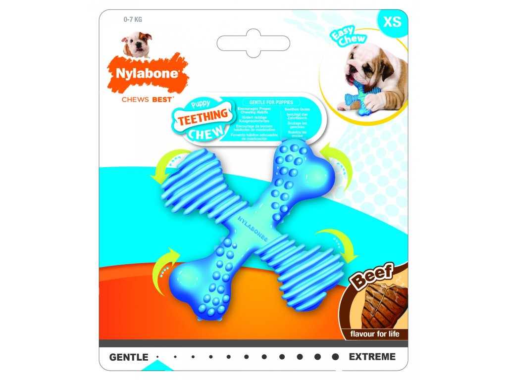 Hračka Nylabone Puppy Teething X Bone Beef SPodporuje správné kousací návyky štěněte. Zklidňuje dásně. Vyrobeno z inertního měkkého termoplastického polymeru, který uspokojí žvýkací instinkt štěňat a podporuje nedestruktivní žvýkání. Kuřecí chuť.