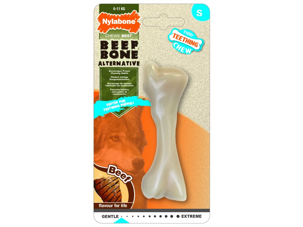 Hračka Nylabone Puppy Beef Bone SPodporuje správné kousací návyky štěněte. Zklidňuje dásně. Vyrobeno z inertního měkkého termoplastického polymeru, který uspokojí žvýkací instinkt štěňat a podporuje nedestruktivní žvýkání. Balení se skládá z 2 kostí. Příchuť hovězího masa.