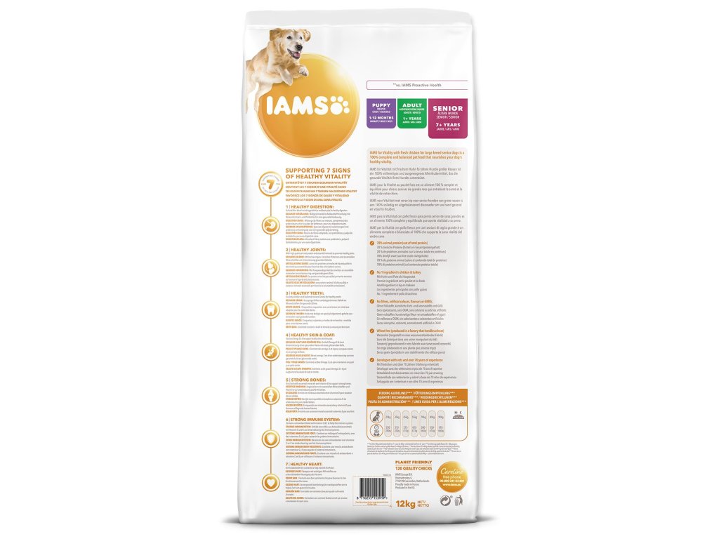 Krmivo IAMS for Vitality pro psí seniory velkých plemen je 100% kompletní a vyvážené, odborníky sestavené krmivo, které bude vašemu zvířeti chutnat a svědčit. Naše nová a vylepšená receptura pro psí seniory s čerstvým kuřecím masem je založena na pečlivě vybraných, kvalitních živočišných bílkovinách, které podporují sedm znaků zdravé vitality psa. Aby byl váš pes zdravý, aktivní a plný energie, obsahují naše lahodné receptury až 78 % živočišných bílkovin (z celkového obsahu bílkovin). Umožněte svému mazlíčkovi užívat si každý den naplno!