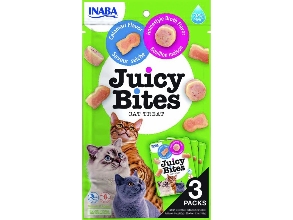 Inaba Juicy Bites - domácí vývar, kalamáry 33,9 gJsou lahodné pamlsky pro kočky ideální velikosti s příchutí domácího vývaru a kalamárů. Vaše kočka vám splní co vám na očích uvidí, když ji odměníte těmito chuťově neodolatelnými zdravými pamlsky. Jsou vláčné, měkké a velikostně ideální ke skousnutí a navíc v zábavných tvarech. Pamlsky jsou vyrobeny z farmově chovaných kuřat a pravého tuňáka, mají nízký obsah kalorií a neobsahují obiloviny, konzervanty ani umělá barviva.