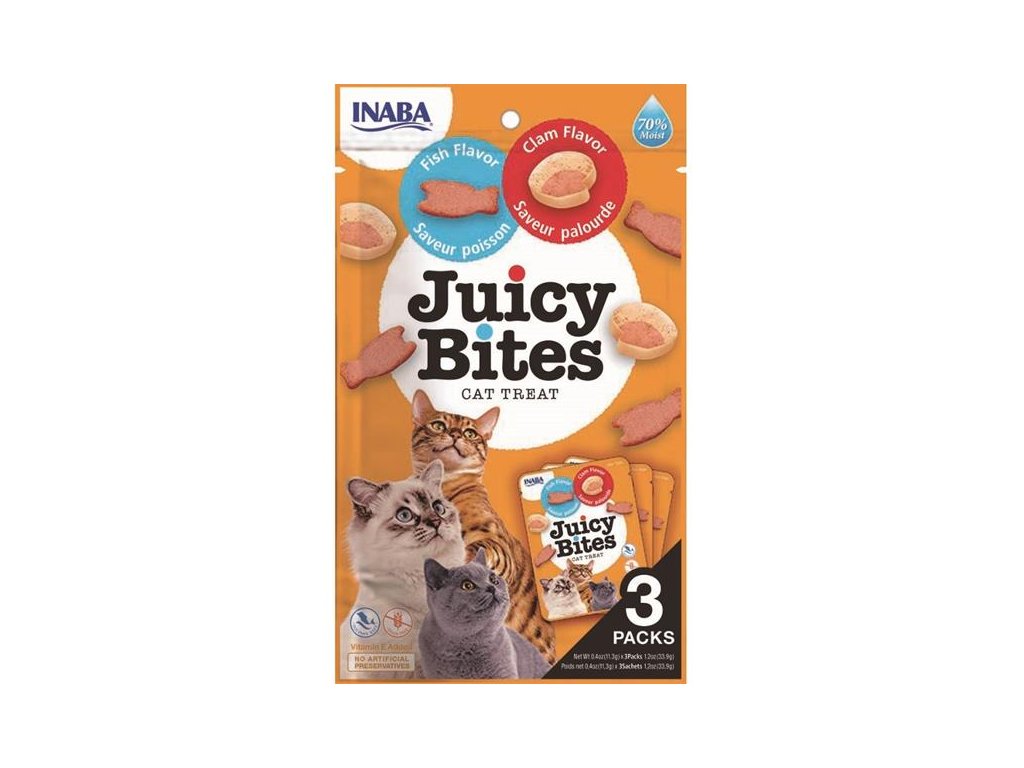 Pamlsky Inaba Juicy Bites ve dvou příchutích – ryba a škeble – jsou vláčné, měkké, přirozeně chutné a hlavně zdravé. Vyrobeny jsou z pravého tuňáka a kuřat chovaných na farmách, mají nízký obsah kalorií a neobsahují obiloviny, konzervanty ani umělá barviva. Pro kočky mají ideální velikost a pro radost všech zúčastněných zábavné tvary.