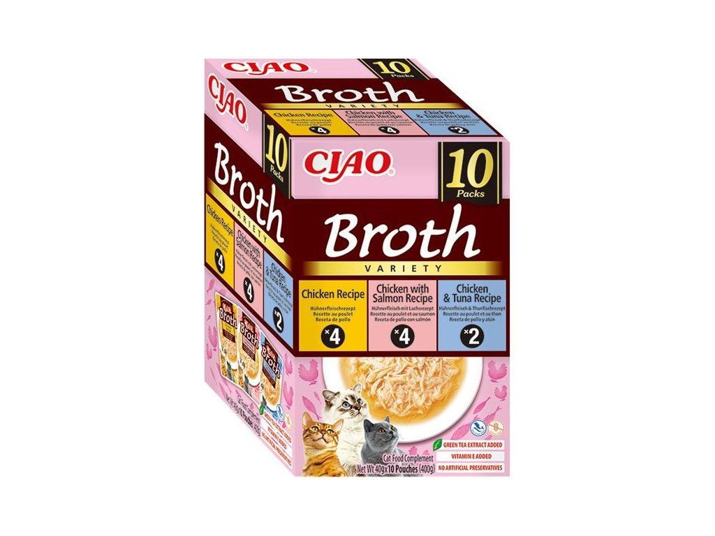 CIAO BROTH Multipack obsahuje 10 kapsiček natrhaného kuřecího masa v lahodném kuřecím vývaru. Pečlivě vybrané suroviny a přísně kontrolovaná čerstvost. Vaše kočka si bude užívat lákavé aroma a neodolatelnou chuť při každém otevření kapsičky! Vyrobeno ze 100% čistého kuřecího prsa. Žádné obiloviny, konzervanty ani umělá barviva. Vysoký obsah vody, který je prospěšný pro celkové zdraví koček. Nízký obsah kalorií.