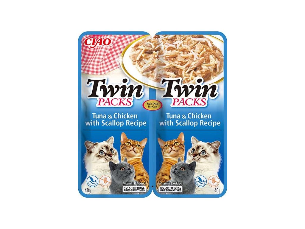 Kapsička Churu Cat Twin Packs - tuňák, kuře a hřebenatky ve vývaruNeodolatelná kapsička pro kočky v praktickém dvojbalení plná masa a lahodného vývaru z hřebenatek. Potěšte své chlupaté přátelé dvojitým balením: praktickou kapsičkou s jednou porcí, aby si vaši mazlíci mohli vychutnat vždy čerstvý plnohodnotný pokrm. Vyrobeno z kuřecího masa a zeleniny s přídavkem sýru. Kapsičky jsou bez obilovin, konzervačních látek a umělých barviv a jsou nízkokalorické. (40 g x 2).