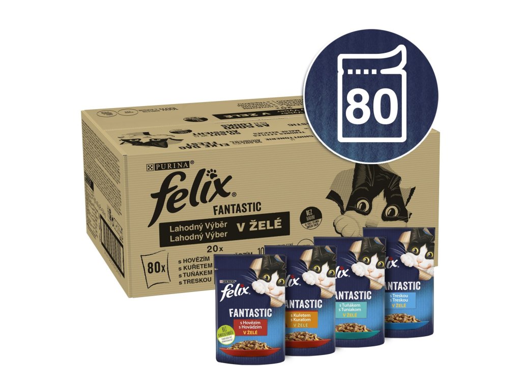 Felix Fantastic Multipack 1(80 x 85 g) hovězí/kuře/tuňák/treska v želéKapsičky pro kočky od 1 roku věku. Felix obsahují kousky masa, které obklopuje šťavnaté želé. Každá receptura kapsiček Felix nabízí nové chuťové možnosti a kombinace. Každá kapsička Felix představuje právě jednu čerstvou krmnou dávku, tedy snídani, oběd a večeři. Kapsičky jsou speciálně namíchané tak, aby v nich byl dokonalý poměr masa, zeleniny a to vše je smíchané v jemném, šťavnatém želé. Vaše kočka bude spokojeně vrnět při každém soustu.