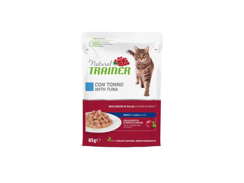 Kapsička Natural Trainer Cat adult tuňák 85 gDopřejte své kočce nejvyšší kvalitu v podobě lahodné kapsičky od Natural Trainer. Ingredience obsažené v kapsičce Natural Trainer jsou přírodního původu, aby vaší kočce přinesly spoustu zdravotních benefitů. Bílkovinovou složkou je tuňák, tučná ryba s vysokou biologickou hodnotou, bohatá na omega-3 a omega-6 mastné kyseliny, vitamin A, vitaminy skupiny B (B12 a niacin), vitamin D, fosfor, zinek, selen, hořčík, železo a jód. Vhodné pro dospělé kočky.