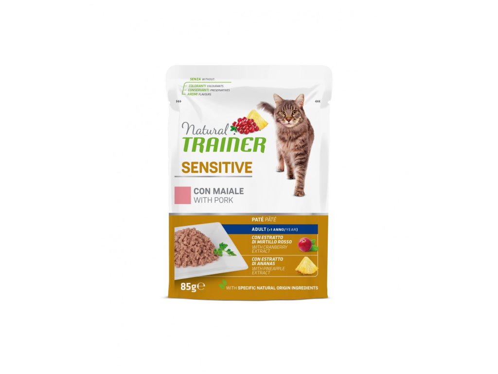 Kapsička Natural Trainer Cat SENSITIVE vepřové 85 gDopřejte vaší dospělé kočce nejvyšší kvalitu v podobě lahodné kapsičky od Natural Trainer. Ingredience obsažené v kapsičce Natural Trainer jsou přírodního původu, aby přinesli zdravotní výhody vaší kočce. Bílkovinovou složkou je zde vepřové maso, které má hodně proteinů, mono-nenasycené mastné kyseliny, zinek, draslík, fosfor, selen, thiamin, vitamin B12, vitamin B6 a niacin. Předností této stravy je její neodolatelná chuť. Bez přidaných konzervačních látek, umělých barviv a dochucovadel. Výhodou je rovněž fakt, že neobsahuje žádné obiloviny. Brusinkový extrakt je bohatý na antioxidanty, jako je vitamin C a proanthokyanidin. Spolu s extraktem z kořene čekanky a kontrolovanou hladinou minerálních látek pomáhá dlouhodobě udržovat správnou funkci močových cest koček. Ananasový extrakt s bromelainem, enzymem, který pomáhá zvýšit stravitelnost bílkovin.