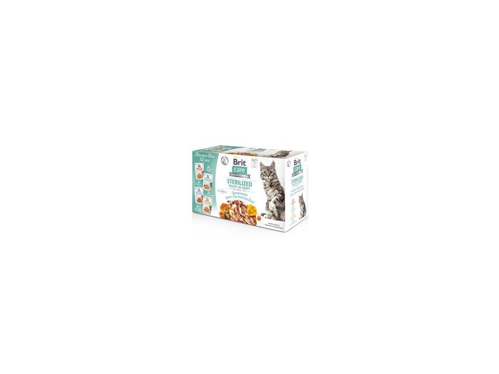Brit Care Cat Sterilized Flavour Box. Fillets in Gravy Enriched with Sea Buckthorn and Nasturtium. Kompletní superprémiové bezobilné mokré krmivo pro dospělé kastrované kočky.
