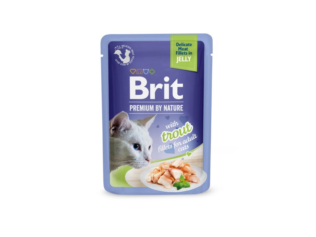 Kapsička Brit Premium Cat Delicate Fillets in Jelly with Trout 85 gŠťavnatá kapsička pro dospělé kočky. Vysoký obsah masa ve filetách zajišťuje neodolatelnou chuť. Díky speciální technice vaření masa v páře si filetky zachovají masovou chuť a vůni. Složení bez umělých barviv a konzervantů.