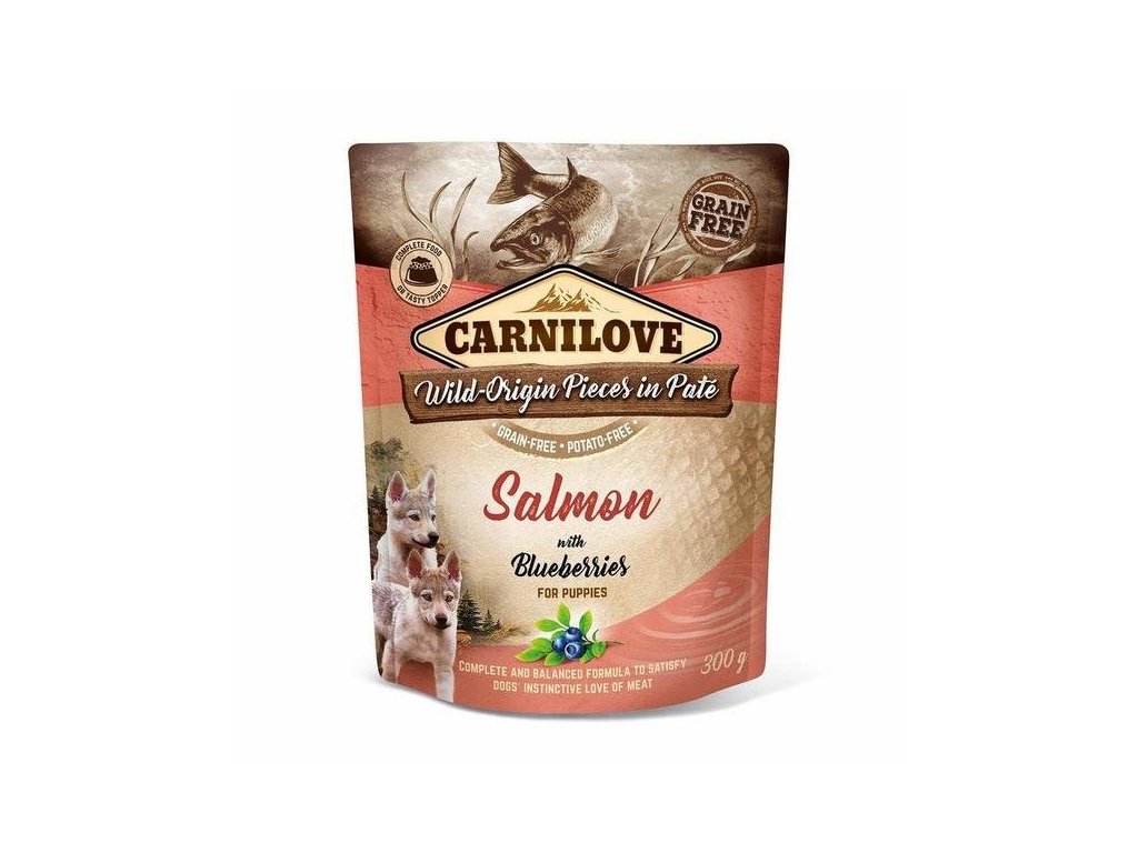 Kapsička Carnilove Dog Paté Salmon with Blueberries for PuppiesPsí kapsička Carnilove je bohatá na maso z lososa a borůvky a navíc neobsahuje žádné GMO, sóju, konzervanty, barviva ani obiloviny. Krmivo je snadno stravitelné, hypoalergenní, přispívá ke zdravému trávení, a protože obsahuje omega 3 mastné kyseliny, podporuje kůži, srdce, mozek, klouby a zdravý vývoj organismu. Kapsička pro štěňata Carnilove Dog Pouch Paté Salmon with Blueberries for Puppies je doplněna borůvkami s příznivým vlivem na močové cesty a zdravý vývoj mozku. Lososové filetky jsou naloženy v paštice a obohaceny o luční a lesní byliny a plody. Krmivo prospívá zažívacímu traktu a přispívá k optimální kondici. Podávejte jako kompletní krmivo anebo polevu na granule.