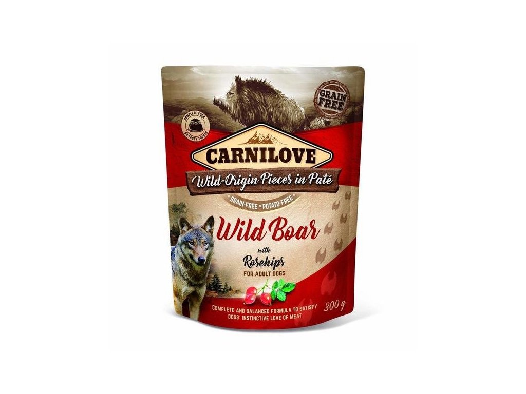 Kapsička Carnilove Dog Paté Wild Boar with Rosehips 300 gLahodná kapsička pro psy s obsahem masa 85 %. Zcela bez obilovin a s antioxidanty, které pozitivně ovlivňují správnou funkci srdce. Maso z divočáka podporuje tvorbu svaloviny a díky nízkému obsahu tuku a cholesterolu je ideální pro udržení správné kondice psa. Šípek podporuje zdravý trávicí trakt, zdravou kůže a má antiseptické účinky. Jemná a měkká konzistence kapsičky může zvýšit atraktivitu misky s granulemi vašeho mazlíčka.