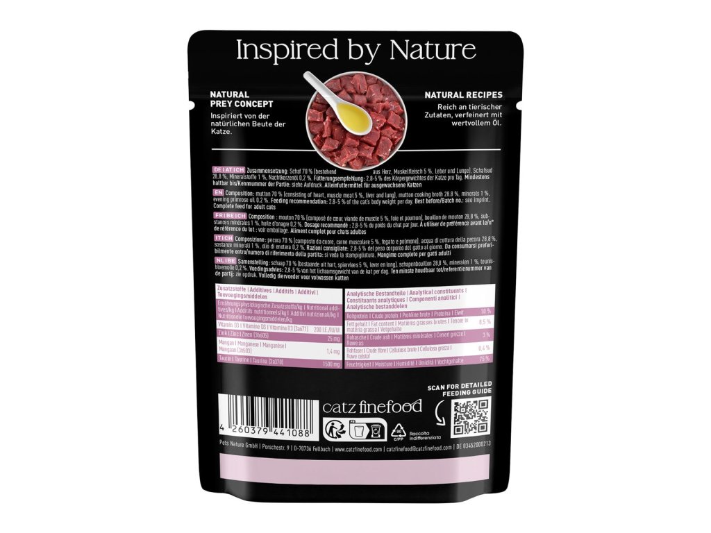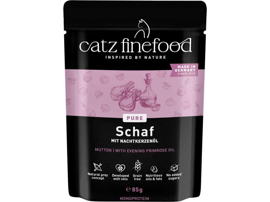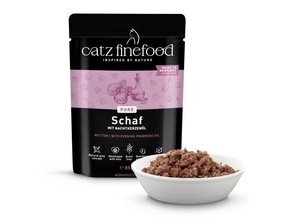 Lahodná kapsička pro kočky, která obsahuje pouze skopové maso, vývar, minerální látky a pupalkový olej. Kapsička je tak vhodná i pro kočky s citlivým zažíváním nebo pro alergické kočky. Jedná se o kompletní krmivo. Suroviny jsou vysoké potravinářské kvality a svým složením odpovídají přirozené kočičí stravě. Jsou bez konzervantů, umělých barviv a dochucovadel. Kapsičky neobsahují geneticky upravené suroviny. Složení: skopové maso 70% (srdce, libové maso 5%, játra, plíce), skopový vývar 28,8%, minerály 1%, pupalkový olej 0,2% Analýza: hrubé proteiny 10,6%, hrubý tuk 7,8%, hrubý popel 3%, hrubá vláknina 0,4%, vlhkost 75% Nutriční doplňkové látky: vitamín D3 200 I.U., taurin 1500 mg, zinek 25 mg, mangan 1,4 mg, jód 0,75 mg Doporučené dávkování: 3-5% tělesné hmotnosti kočky denně. Krmnou dávku přizpůsobte váze, věku a aktivitě kočky. Zajistěte dostatek pitné vody. Datum minimální trvanlivosti a číslo šarže najdete na zadní straně obalu. Krmivo skladujte v suchu. Po otevření skladujte v lednici a co nejdříve spotřebujte. Catz finefood – lahodné kapsičky a konzervy pro kočky, kvalitní krmivo vyrobené v Německu! Zodpovědný chov začíná výběrem potravy – vitalita a zdraví zvířete závisí totiž velkou měrou právě na tom, čím Vaší kočku krmíte. Catz finefood představuje zdravé a vyvážené krmivo pro kočky. Jednotlivé porce krmiva jsou připravené tak, aby odpovídali přirozené potravě koček – kořisti. Catz finefood spojuje místní charakter jednotlivých regionů s dlouholetou zkušeností a znalostí výroby kočičího krmiva nejvyšší kvality. Všechny suroviny jsou odebírány od prověřených a převážně německých producentů. Při výrobě Catz finefood je kladen velký důraz na transparentnost výrobního procesu. Zásadně bez používání příměsí, barviv a feromonů stejně jako podřadných proteinů. Podle názoru koček je Catz finefood chutné a zdravé! Mňauuu!Doplňkové parametry