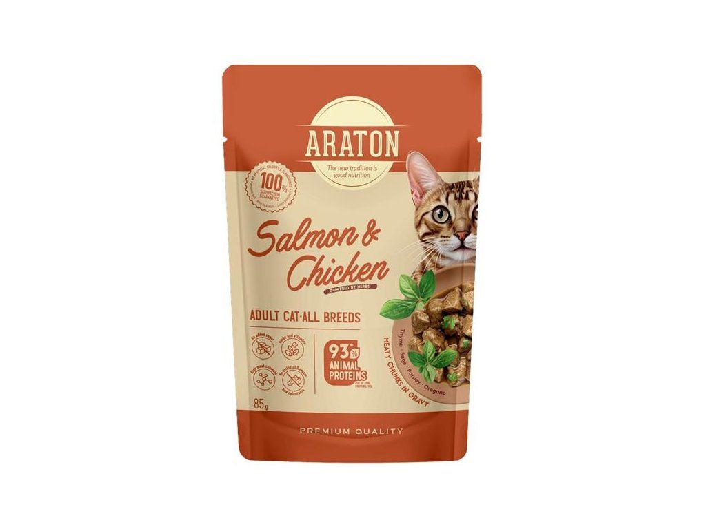 Kompletní vlhké krmivo Araton bylo vyvinuto pro každodenní krmení dospělých koček všech plemen bez nadbytečných přísad, ale s maximálním přínosem pro zdraví. Kousky v šťavnaté omáčce, 76 % složek živočišného a vodního původu, doplněné o byliny – vše vytvořeno s ohledem na přirozené instinkty koček a přání majitele dopřát jim to nejlepší.