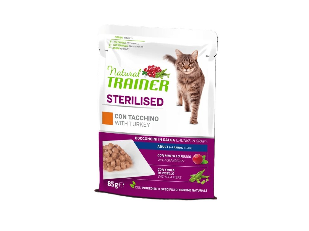 Kapsička Natural Trainer Cat STERILISED krůta 85 gDopřejte své kočce nejvyšší kvalitu v podobě lahodné kapsičky od Natural Trainer. Ingredience obsažené v kapsičce Natural Trainer jsou přírodního původu, aby přinesli zdravotní výhody vaší kočce. Bílkovinovou složkou je zde krůtí maso bohaté na esenciální aminokyseliny, se sníženým obsahem sodíku, tuků a kalorií. Dále obsahuje vitaminy skupiny B, fosfor, hořčík, železo, zinek, vápník a selen. Bez přidaných konzervačních látek, umělých barviv a dochucovadel. Určeno pro dospělé kastrované kočky.