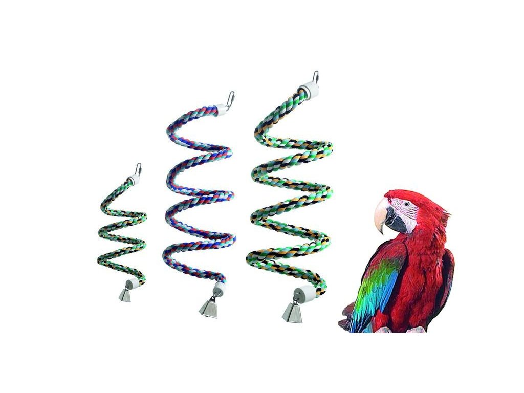 Karlie bavlněná spirálaOhebné ocelové lanko omotané barevným bavlněným provazem má na jednom konci pevný šroubovací uzávěr. Díky němu může být spirála zavěšena od stropu klece. Její délku můžete upravovat tvarováním lanka. Na druhém konci spirály je zvoneček, který dá vědět o každé ptačí aktivitě okolo.