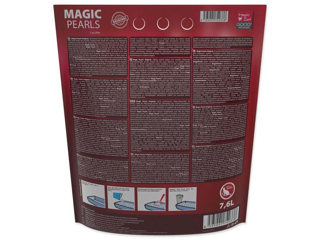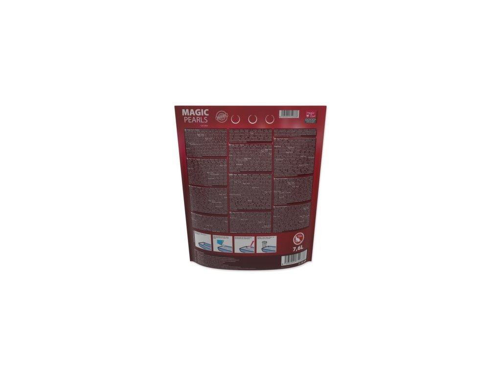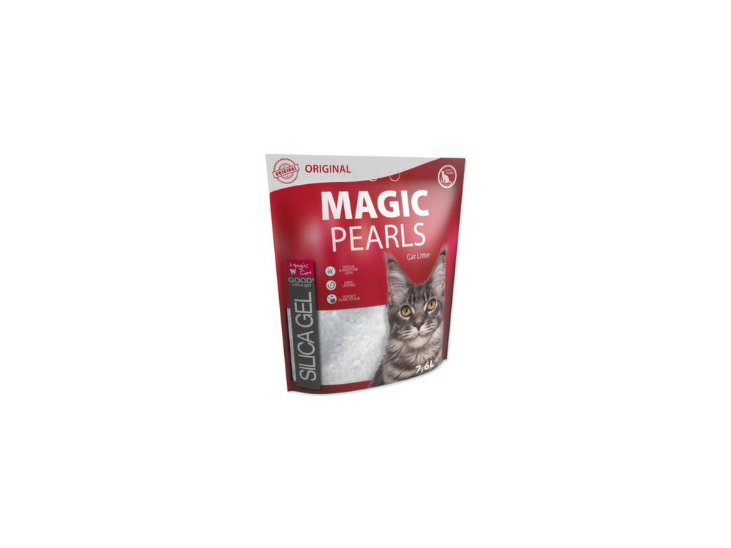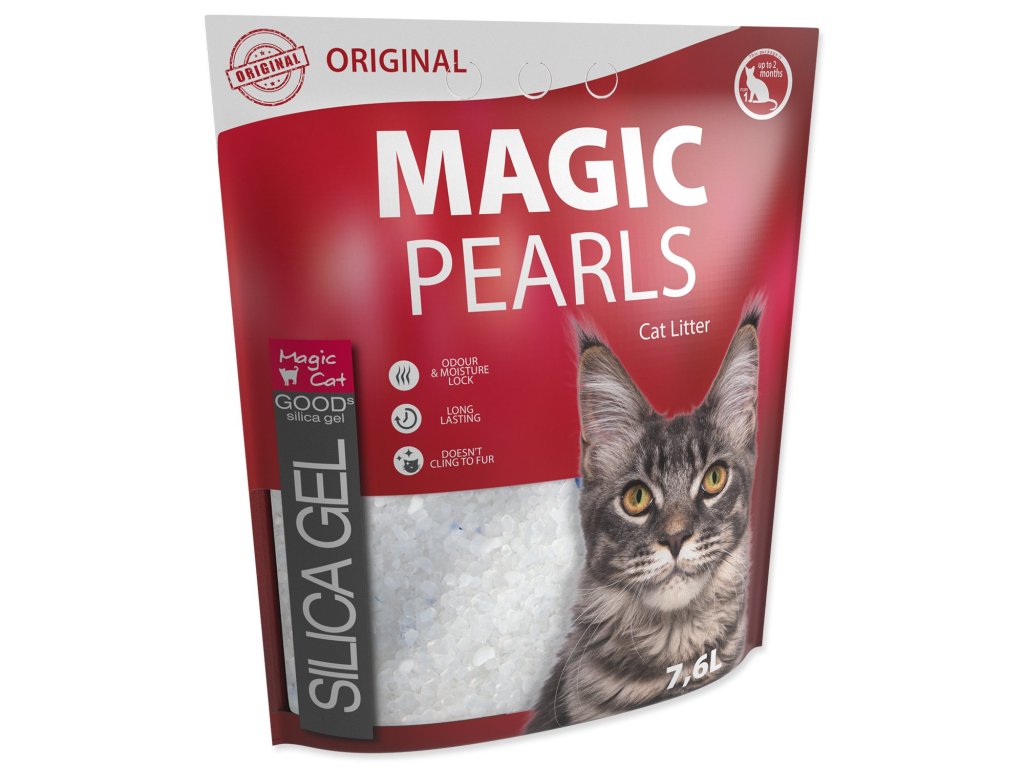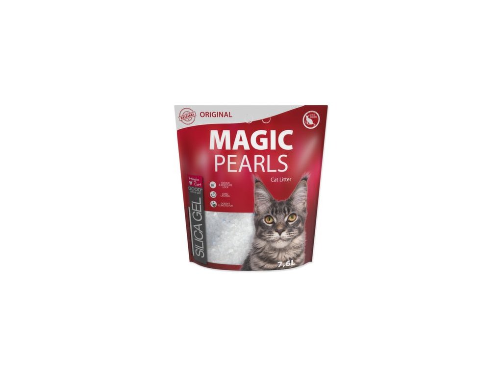 Neparfémované silikátové stelivo pro kočky. Díky mikropórům na sebe stelivo velice rychle váže tekutiny, které uzamkne uvnitř krystalků a eliminuje nepříjemný zápach. Tím zároveň zabraňuje množení nebezpečných bakterií. Díky tomuto inovativnímu procesu má stelivo Magic Pearls extrémní savost a udržuje toaletu suchou a čistou. Stelivo Magic Pearls je bezprašné a neulpívá na tlapkách a srsti zvířat, takže není kočkami vynášeno mimo toaletu. Stelivo je vhodné i pro dlouhosrstá plemena koček. Stelivo Magic Pearls v toaletě vydrží absorbovat pachy a vlhkost až 4 týdny (při použití jednou kočkou), proto je jeho použití také velice ekonomické, není třeba jej měnit tak často jako jiné druhy steliv.