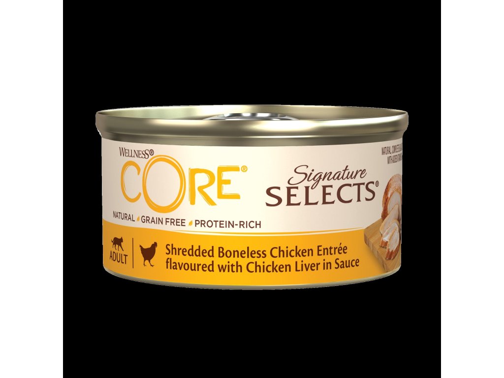 Konzerva Wellness Core Cat Selects Shredded kuře s játry v omáčce 79g