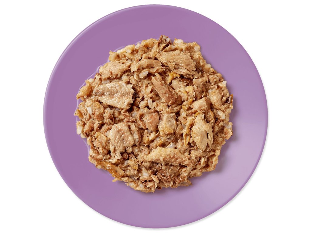 Ryby a výrobky z ryb (makrela 70%, sardinky 5%), rybí vývar 24%, rýže 1%.
