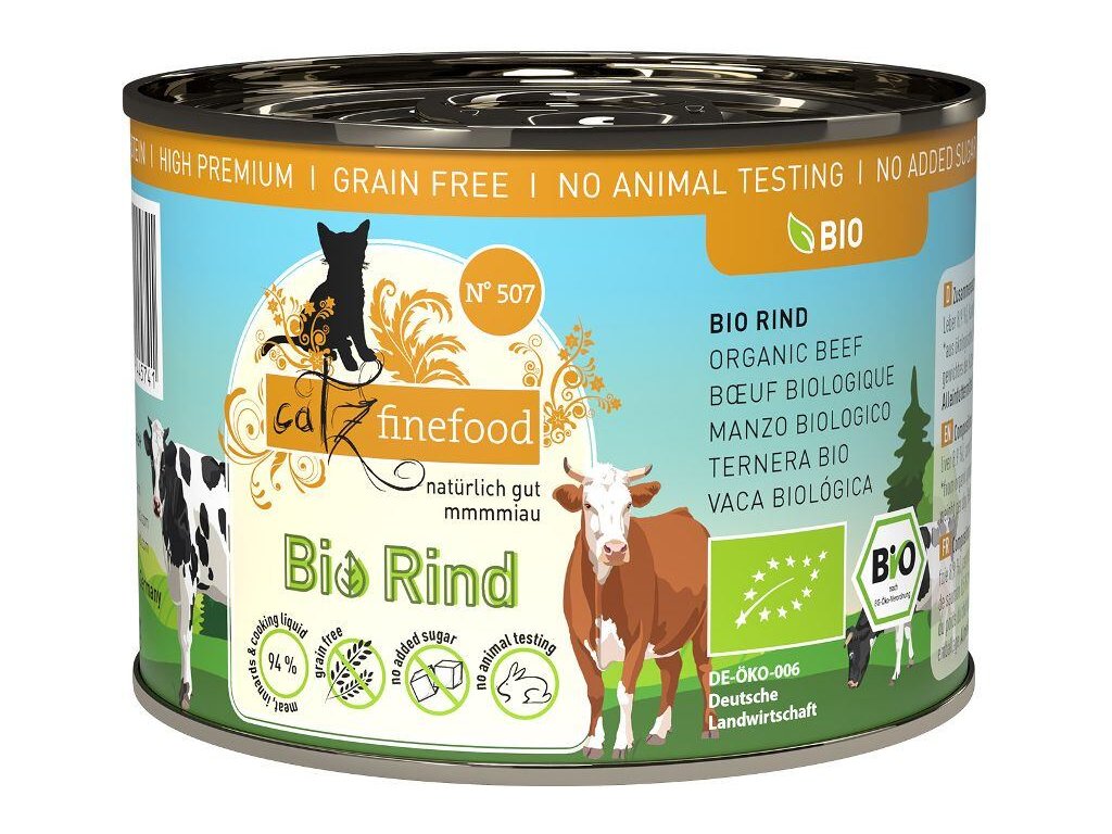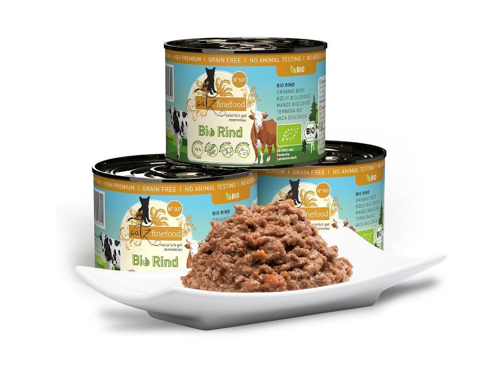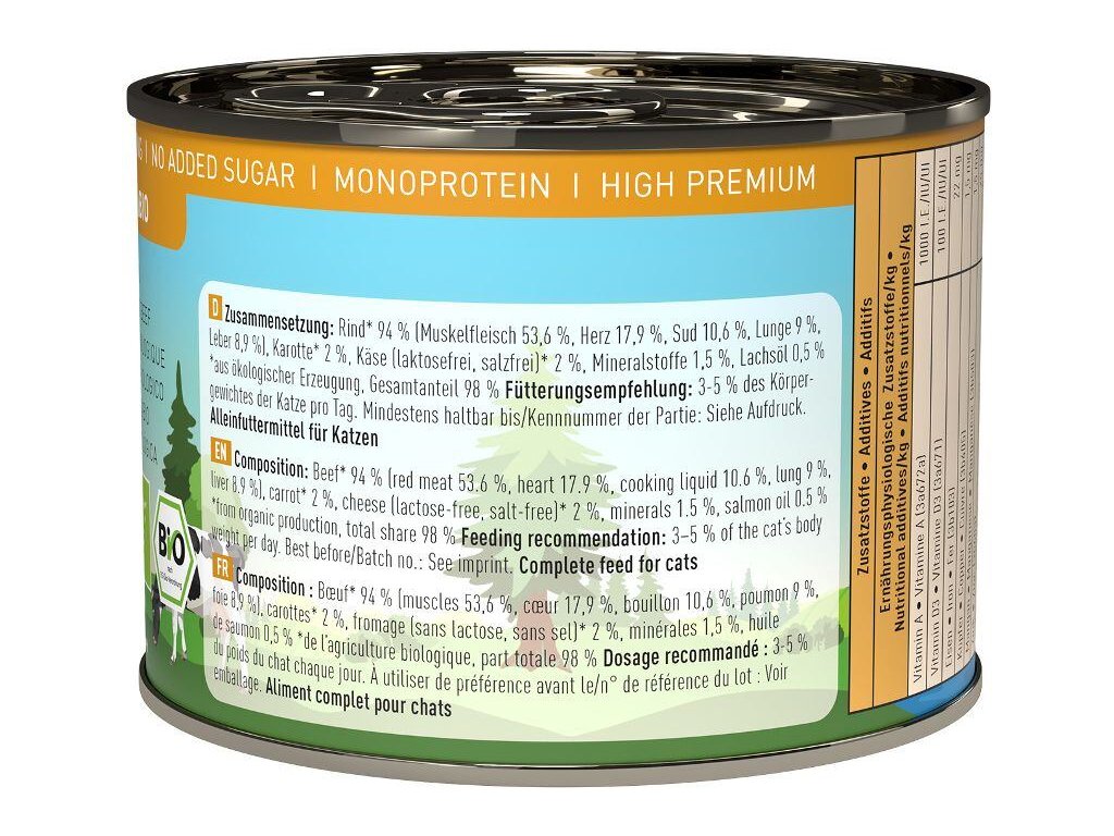 Kompletní monoproteinové krmivo v bio kvalitě, které zajistí vaší kočce vyváženou stravu. Všechny suroviny jsou certifikované a pochází z ekologického zemědělství. Kočky milují výtečnou chuť čerstvě zpracovaného masa a drobů té nejvyšší kvality. Krmivo Catz finefood Bio je ideální také pro kočky s citlivým zažíváním či potravinovými alergiemi. Krmivo neobsahuje konzervanty, umělá barviva, dochucovadla a geneticky upravené suroviny. - Bezobilná receptura - Žádná masokostní moučka - Bez přidaného cukru - Žádná dochucovadla, umělá barviva a konzervanty - Žádné geneticky modifikované suroviny - Žádné levné náhrady bílkovin Certifikace zajišťuje, že všechny použité suroviny pochází z hospodářských zvířat či ovoce a zeleniny z certifikovaného ekologického zemědělství. Zaručuje nejvyšší úroveň kvality bez použití preventivních antibiotik, růstových stimulátorů, syntetických pesticidů a hnojiv. Složení: hovězí 94 % (svalovina 53,6 %, srdce 17,9%, vývar 10,6 %, plíce 9 %, játra 8,9 %), mrkev 2 %, sýr (bez laktózy, bez soli) 2 %, minerální látky 1,5 %, lososový olej 0,5 % Analýza: hrubé bílkoviny 12 %, hrubé oleje a tuky 10,2 %, hrubé popeloviny 1,5 %, hrubá vláknina 0,3 %, vlhkost 75,6 % Nutriční doplňkové látky na 1 kg: vitamin A 1000 I.E., Vitamin D3 100 I.E., železo 22 mg, měď 1,5 mg, mangan 1,5 mg, zinek 25 mg, selen 0,1 mg, taurin 1300 mg Doporučené dávkování: 3-5 % tělesné hmotnosti kočky denně. Krmnou dávku přizpůsobte váze, věku a aktivitě kočky. Zajistěte dostatek pitné vody. Datum minimální trvanlivosti a číslo šarže najdete na zadní straně obalu. Krmivo skladujte v suchu. Po otevření skladujte v lednici a co nejdříve spotřebujte.Doplňkové parametry
