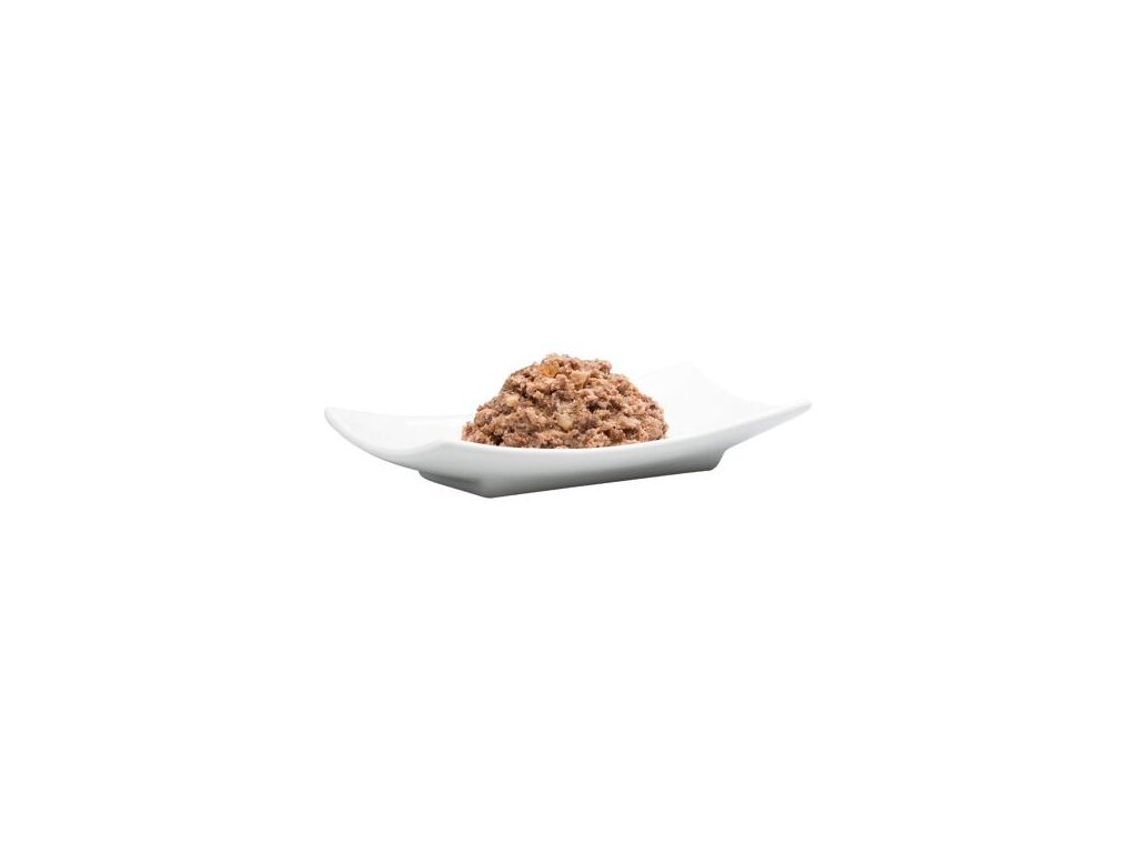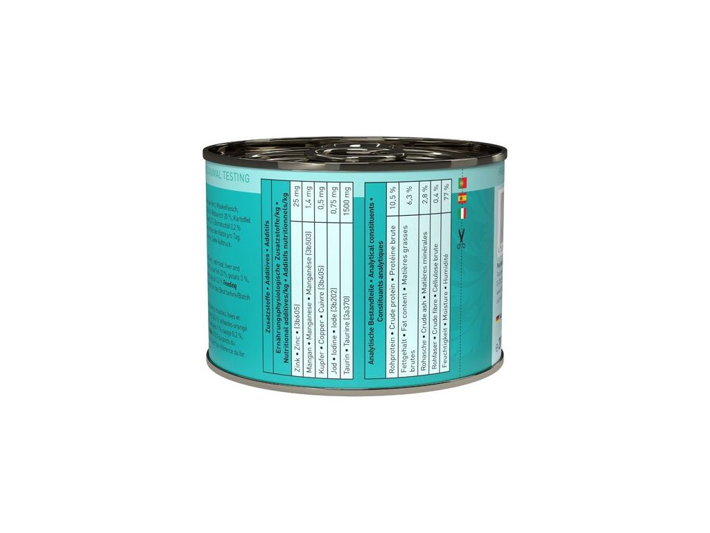 Lahodná konzerva pro kočky, která obsahuje vysoký podíl zvěřiny a rybího masa okouníka mořského, zdraví prospěšné borůvky a šalvěj. Konzervy Catz finefood obsahují pouze suroviny vysoké potravinářské kvality a svým složením odpovídají přirozené kočičí stravě. Jsou bez konzervantů, umělých barviv a dochucovadel. Konzervy neobsahují geneticky upravené suroviny. Jedná se o kompletní krmivo. Složení: zvěřina 50% (srdce, svalovina, plíce a játra), vývar ze zvěřiny a okouníka mořského 23,6%, maso okouníka mořského 20%, brambory 3%, borůvky 2%, minerální látky 1%, šalvěj 0,2%, brutnákový olej 0,2% Analýza: bílkoviny 10,5%, tuk 6,3%, popeloviny 2,8%, vláknina 0,4%, vlhkost 77% Nutriční doplňkové látky na 1 kg: zinek 25 mg, mangan 1,4 mg, jód 0,75 mg, měď 0,5 mg, taurin 1500 mg Doporučené dávkování: 3-5% tělesné hmotnosti kočky denně. Krmnou dávku přizpůsobte váze, věku a aktivitě kočky. Zajistěte dostatek pitné vody. Datum minimální trvanlivosti a číslo šarže najdete na zadní straně obalu. Krmivo skladujte v suchu. Po otevření skladujte v lednici a co nejdříve spotřebujte. Catz finefood – lahodné kapsičky a konzervy pro kočky, kvalitní krmivo vyrobené v Německu! Zodpovědný chov koček začíná už výběrem potravy. Vitalita a zdraví zvířete závisí totiž velkou měrou právě na tom, čím Vaší kočku krmíte. Catz finefood je zdravé a vyvážené krmivo pro kočky. Jednotlivé porce krmiva jsou připravené tak, aby odpovídali přirozené potravě koček – kořisti. Catz finefood spojuje místní charakter jednotlivých regionů s dlouholetou zkušeností a znalostí výroby kočičího krmiva nejvyšší kvality. Všechny suroviny jsou odebírány od prověřených a převážně německých producentů. Při výrobě Catz finefood je kladen velký důraz na transparentnost výrobního procesu. Zásadně bez používání příměsí, barviv a feromonů stejně jako podřadných proteinů. Z tohoto důvodu Catz finefood neobsahuje: - žádný masový separát, - žádnou kostní moučku, - žádné proteinové náhražky jako je sója, - žádné obiloviny, - žádná umělá barviva, - žádné feromony, - žádná umělá aromata, - žádné geneticky upravené suroviny, a žádné konzervační látky. Podle názoru koček je Catz finefood chutné a zdravé! Mňauuu!Doplňkové parametry