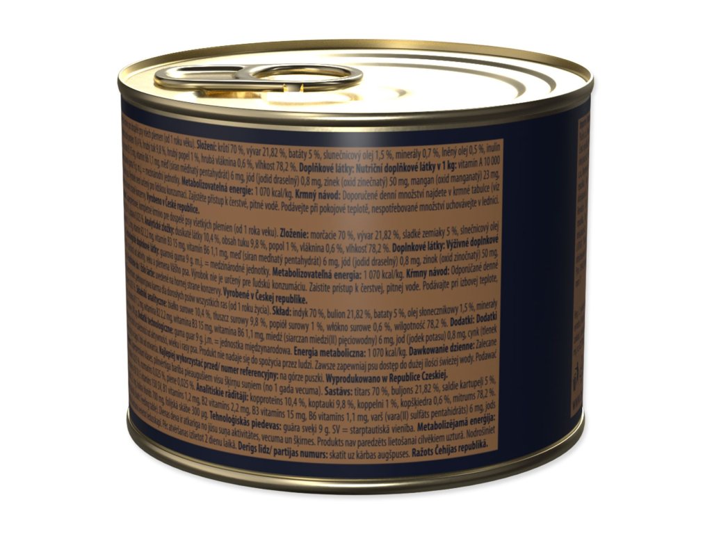 Potravinové intolerance dokážou potrápit. Řešením je jednoduchost. Tato receptura stojí na jediném druhu živočišné bílkoviny - krůtím mase. S obsahem 91 % masa a vývaru nabízí skvělou chuť, ale minimalizuje riziko reakce. Krůtí maso je dietní a skvěle stravitelné, takže nezatěžuje organismus a dodává energii bez pocitu těžkosti.