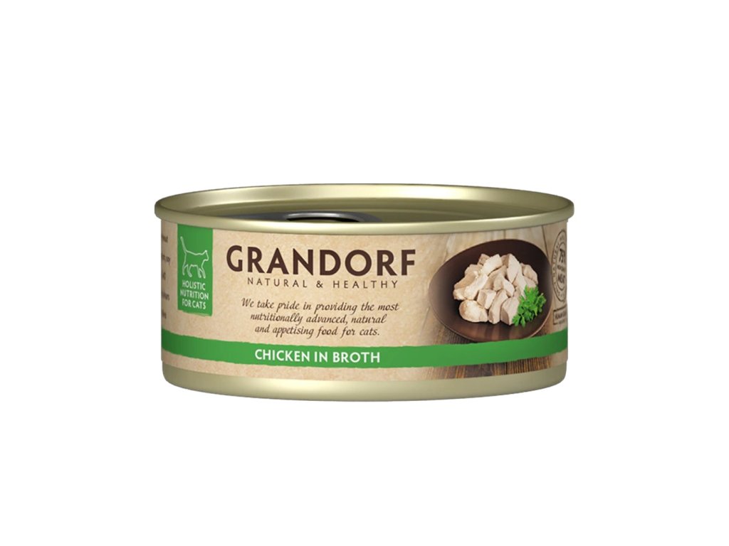 Šťavnatá kuřecí prsa ve vlastní šťávě pro vaše kočičky. Čisté maso, které poznáte na první pohled. Přírodní doplňkové bezobilné krmivo pro pro dospělé kočky vyrobené z vybraných masových filetů, vařených ve vlastní šťávě. Jen maso a nic víc, perfektní doplněk suchého krmiva pro zpestření kočičího jídelníčku. Dopřejte své kočce skutečnou masovou pochoutku.Konzervy Grandorf pro kočky obsahují pouze kvalitní maso v celých kouscích, žádné náhražky ani imitace masa. Díky vysokému podílu čistého masa (75 %) nabízí přirozenou a chutnou lahůdku, kterou si vaše kočka zamiluje. Stačí otevřít konzervu a kvalitu uvidíte na první pohled. Poctivé kousky masa v přirozené šťávě vás nenechají na pochybách, čím svou kočku krmíte. S Grandorfem máte jistotu čistého složení a chuti, kterou si vaše kočky zamilují.