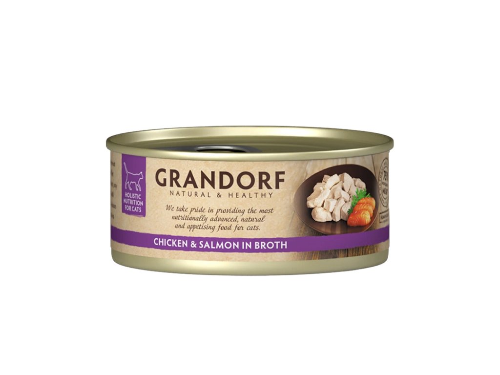 Kuře, které voní lososem, lákavá kočičí lahůdka pro fajnšmekry. Čisté maso, které poznáte na první pohled. Přírodní doplňkové bezobilné krmivo pro pro dospělé kočky vyrobené z vybraných masových filetů, vařených ve vlastní šťávě. Jen maso a nic víc, perfektní doplněk suchého krmiva pro zpestření kočičího jídelníčku. Dopřejte své kočce skutečnou masovou pochoutku.Konzervy Grandorf pro kočky obsahují pouze kvalitní maso v celých kouscích, žádné náhražky ani imitace masa. Díky vysokému podílu čistého masa (75 %) nabízí přirozenou a chutnou lahůdku, kterou si vaše kočka zamiluje. Stačí otevřít konzervu a kvalitu uvidíte na první pohled. Poctivé kousky masa v přirozené šťávě vás nenechají na pochybách, čím svou kočku krmíte. S Grandorfem máte jistotu čistého složení a chuti, kterou si vaše kočky zamilují.