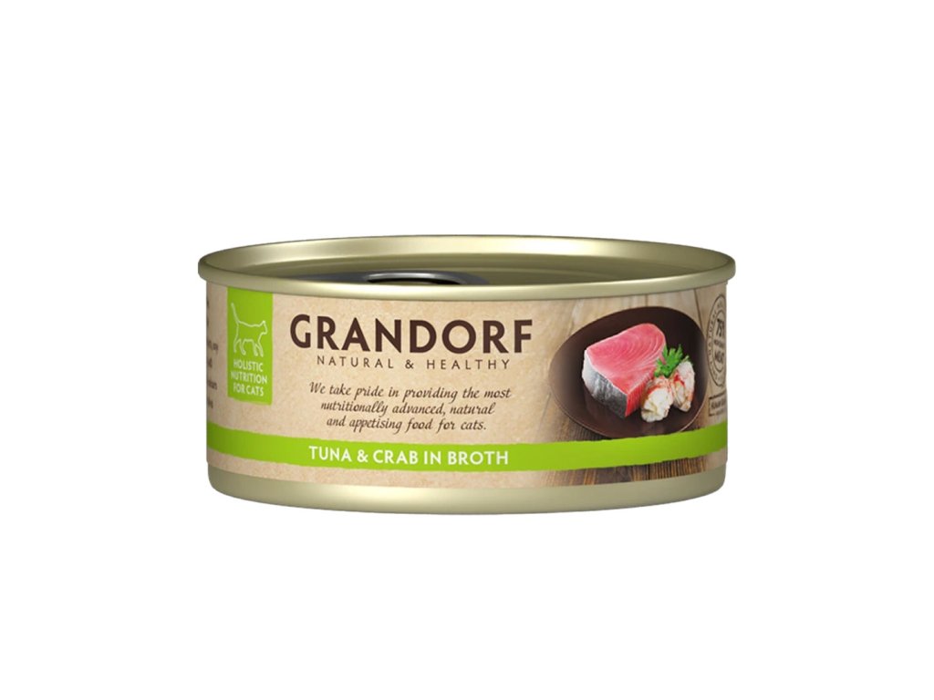 Krabí lahůdka v moři tuňáka, neodolatelná kombinace pro kočičí gurmány. Čisté maso, které poznáte na první pohled. Přírodní doplňkové bezobilné krmivo pro pro dospělé kočky vyrobené z vybraných masových filetů, vařených ve vlastní šťávě. Jen maso a nic víc, perfektní doplněk suchého krmiva pro zpestření kočičího jídelníčku. Dopřejte své kočce skutečnou masovou pochoutku.Konzervy Grandorf pro kočky obsahují pouze kvalitní maso v celých kouscích, žádné náhražky ani imitace masa. Díky vysokému podílu čistého masa (75 %) nabízí přirozenou a chutnou lahůdku, kterou si vaše kočka zamiluje. Stačí otevřít konzervu a kvalitu uvidíte na první pohled. Poctivé kousky masa v přirozené šťávě vás nenechají na pochybách, čím svou kočku krmíte. S Grandorfem máte jistotu čistého složení a chuti, kterou si vaše kočky zamilují.