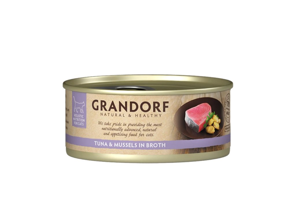 Skutečná specialita pro kočičí milovníky ryb, tuňák s celými mušlemi. Čisté maso, které poznáte na první pohled. Přírodní doplňkové bezobilné krmivo pro pro dospělé kočky vyrobené z vybraných masových filetů, vařených ve vlastní šťávě. Jen maso a nic víc, perfektní doplněk suchého krmiva pro zpestření kočičího jídelníčku. Dopřejte své kočce skutečnou masovou pochoutku.Konzervy Grandorf pro kočky obsahují pouze kvalitní maso v celých kouscích, žádné náhražky ani imitace masa. Díky vysokému podílu čistého masa (75 %) nabízí přirozenou a chutnou lahůdku, kterou si vaše kočka zamiluje. Stačí otevřít konzervu a kvalitu uvidíte na první pohled. Poctivé kousky masa v přirozené šťávě vás nenechají na pochybách, čím svou kočku krmíte. S Grandorfem máte jistotu čistého složení a chuti, kterou si vaše kočky zamilují.