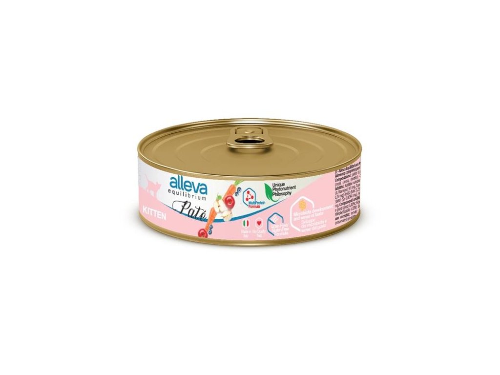 Alleva Equilibrium Kitten Paté je vysoce kvalitní kompletní mokré krmivo určené pro podporu harmonického růstu a vyváženého vývoje koťat. Multiproteinová receptura založená na vysoce kvalitních surovinách poskytuje všechny nezbytné živiny pro zajištění energie, vitality a správného vývoje svalů v rané fázi života. Přírodní fytonutrienty z jablek, mrkve a borůvek pomáhají udržovat optimální nutriční rovnováhu. Absence obilovin (grain-free) a škrobů podporuje trávení a zdraví střev. Měkká textura paštiky a aroma činí konzervu velmi chutnou a podporuje správný úvod do tuhé stravy koťat během odstavu a v prvních měsících života.
