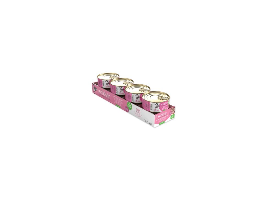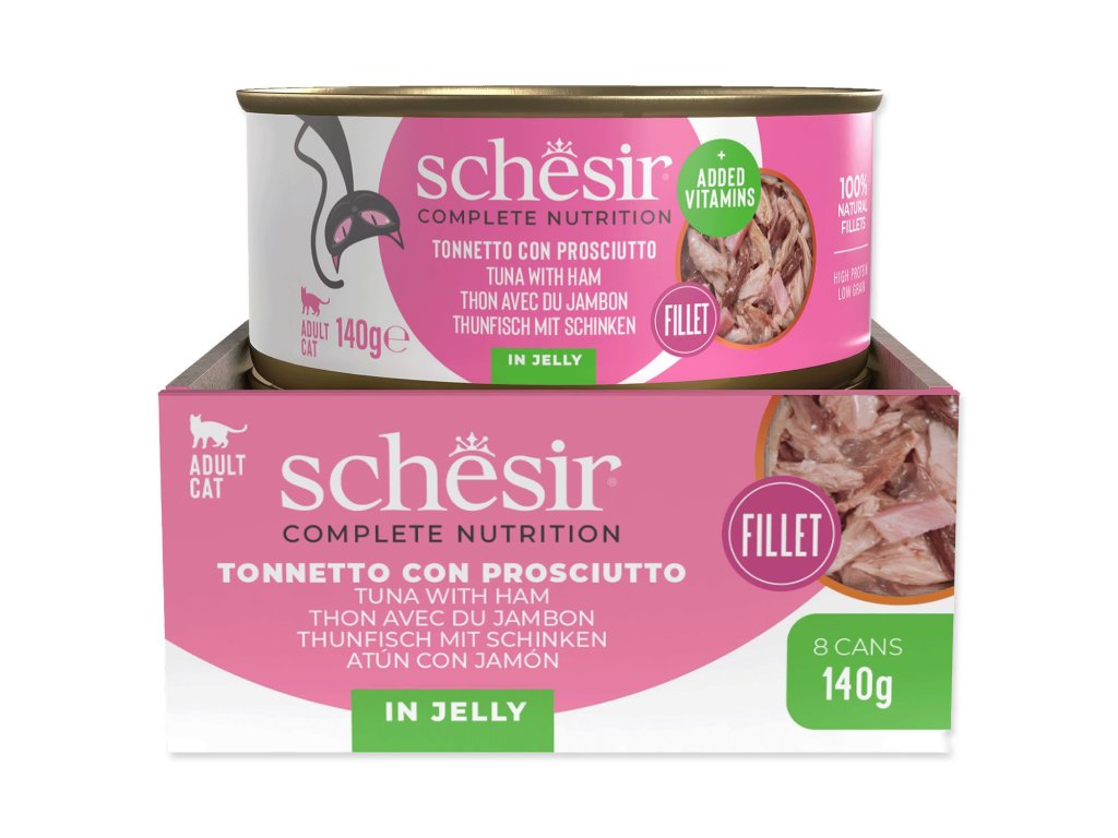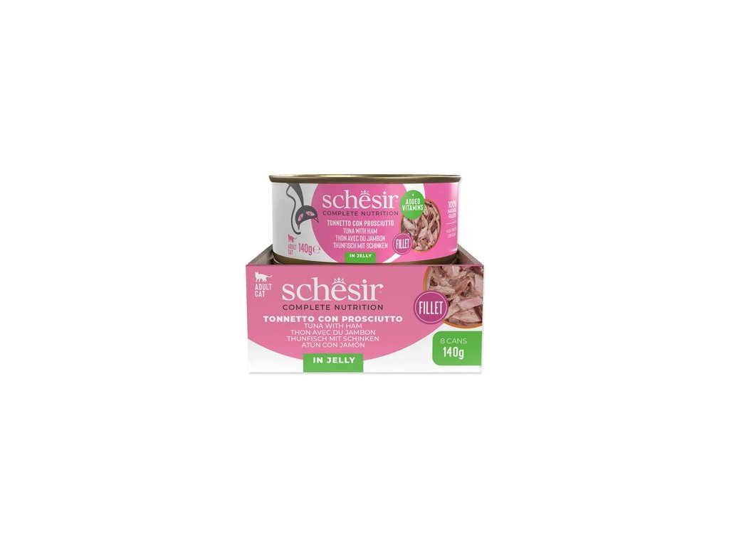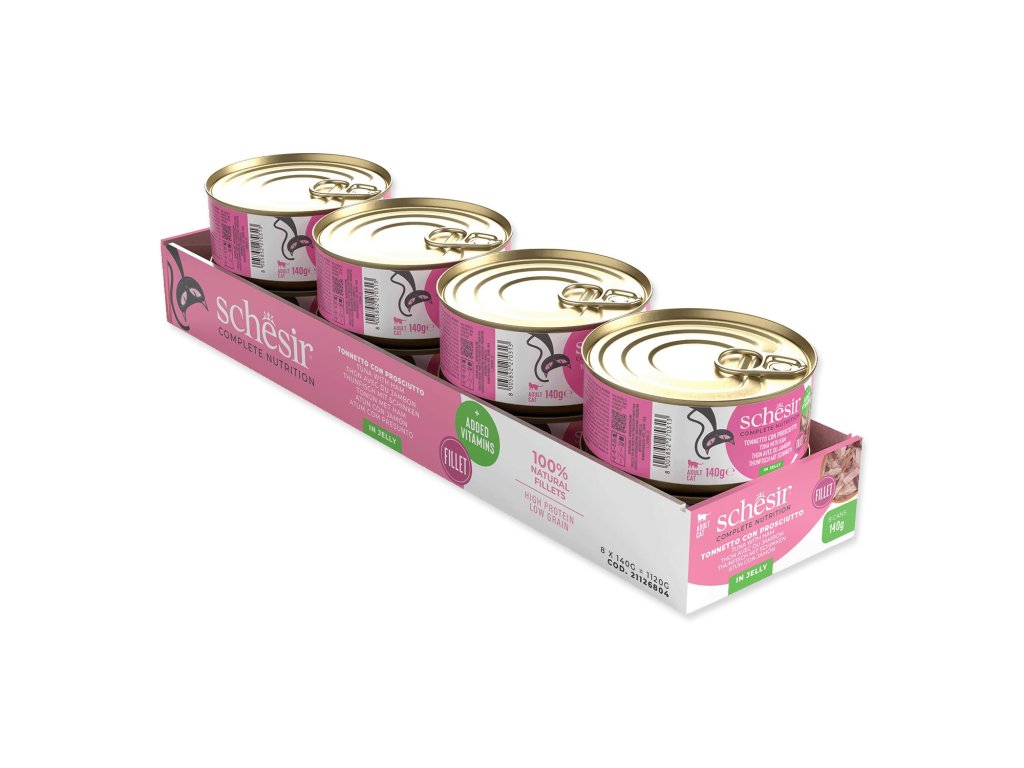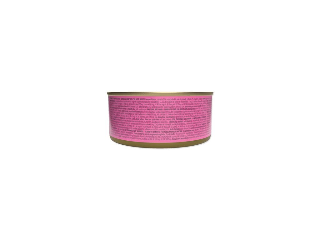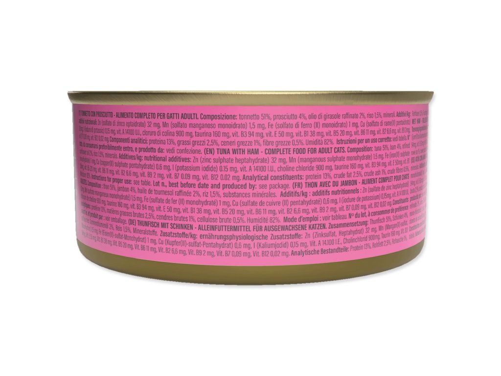 Konzerva s masem z tuňáka se šunkou v želé. Doplňkové krmivo pro dospělé kočky.