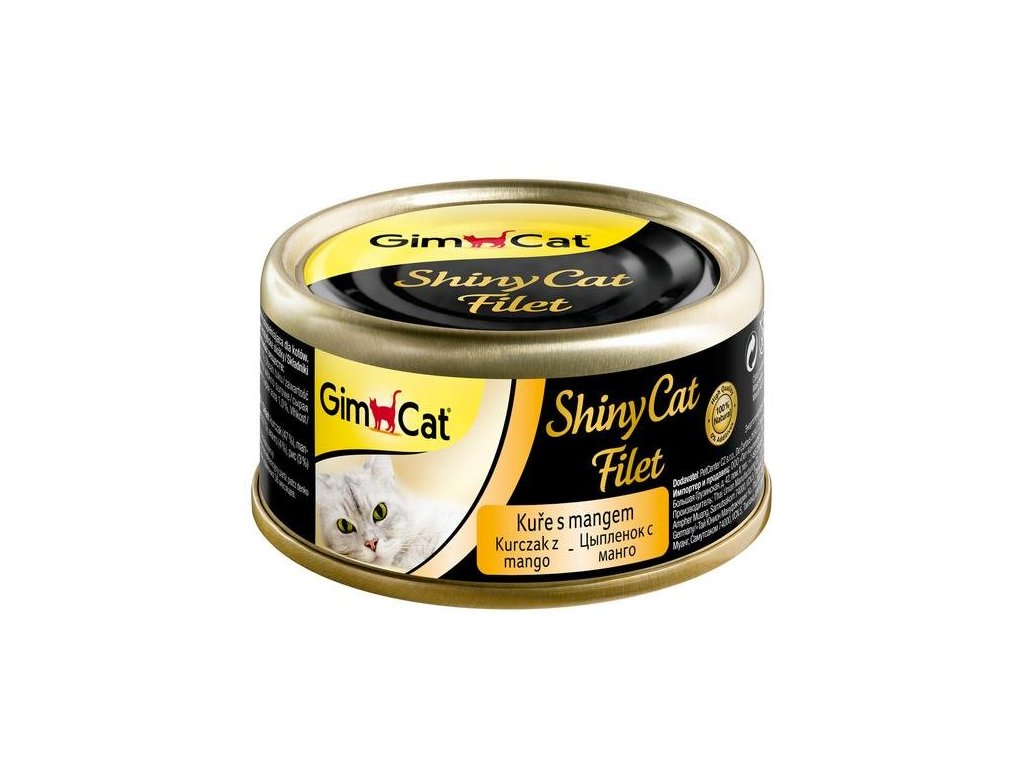 Konzerva Shiny Cat filet kuře s mangemChutné kuřecí konzervy s mangem. Jemná chuť a ideální nutriční složení tohoto exotického ovoce přinese vaší kočce opravdový zážitek z krmení. Gim Cat Filet obsahuje chutné kousky masa s vysokým obsahem bílkovin uzavřené šetrným způsobem. Doplňkové krmivo pro kočky.