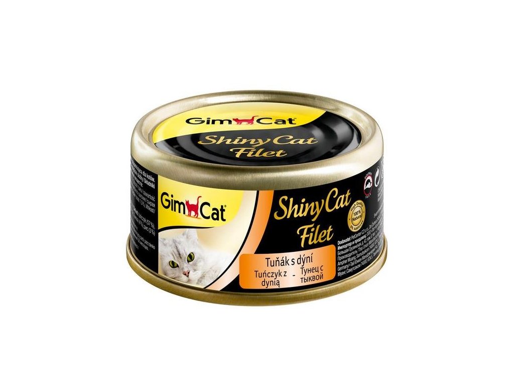 Konzerva ShinyCat filet tuňák s dýniGimCat Shiny Cat Filet je konzerva s pořádnou dávkou tuňáka ve vývaru a dýně. Zvýšené množství bílkovin posiluje imunitní systém a celkové zdraví organismu kočky. Krmivo obsahuje pouze 2% tuku, je vhodné i pro kočky, které potřebují redukovat váhu nebo pro kočky kastrované. Kousky voňavé ryby jsou na kočičím jídelníčku opravdovou delikatesou, kterou jim můžete dopřát beze strachu o jejich váhu.