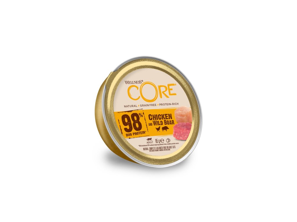 Wellness Core 98% kuřecí/divočák recepturaWellness CORE 98% je přírodní, inovativní a zdravé mokré krmivo bez obilovin v podobě chutné paštiky pro dospělé kočky. Receptury jsou založeny na volbě kvalitních ingrediencí, které vaší kočce zaručí vysoký obsah bílkovin a potřebné vitaminy. Kompletní krmivo v praktických konzervách vám zaručí pohodlnou manipulaci, ideální dávkování a především kvalitní obsah. Bílkovinnou složkou je kuřecí maso a divočák. Wellness Core 98% najdete také v příchutích hovězí, krůtí, kuřecí/losos.