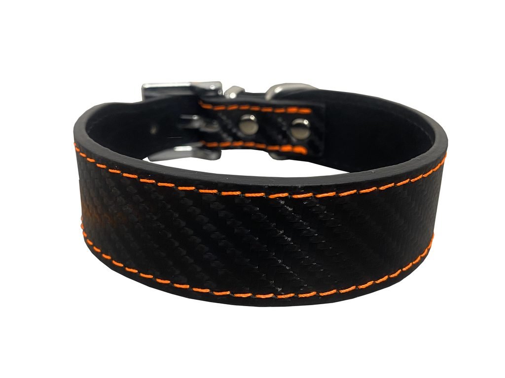 Vnější vrstva obojku je zhotovena z odolné kůže ve vzhledu carbonu, která vyniká svým lesklým povrchem a originálním strukturálním designem. Vnitřní stranu tvoří jemná, měkká vrchová kůže, která je příjemná na dotek a šetrná. Kombinace těchto dvou materiálů zajišťuje, že obojek je nejen vizuálně atraktivní, ale i velmi komfortní při nošení.