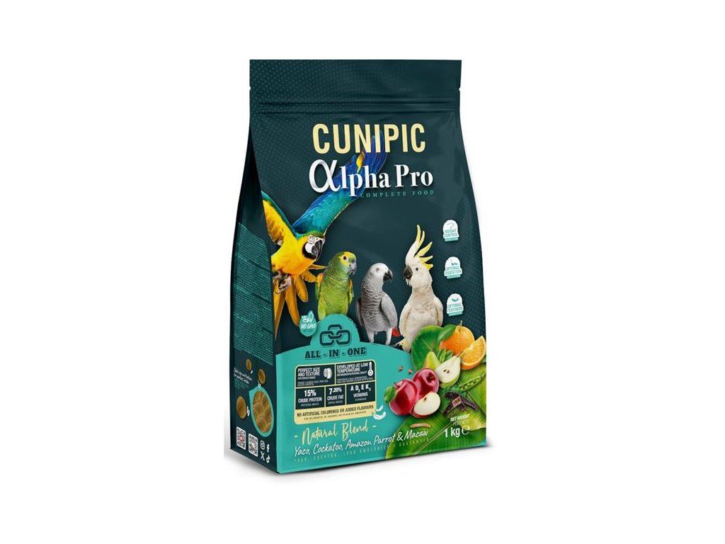 Cunipic Alpha Pro Natural Blend je kompletní a vyvážené přírodní krmivo pro velké papoušky (např. žako, kakadu, amazoňan nebo ara). Díky koncepci „All in One“ obsahuje každá granule všechny důležité živiny, takže papoušek nemůže vybírat jen to, co mu chutná. Nízkoteplotní zpracování uchovává živiny a zajišťuje krmivu maximální výživovou hodnotu. Krmivo podporuje trávení, vitalitu a zdraví kostí i srdce, neobsahuje přidané cukry ani umělá barviva a přispívá k dlouhému a zdravému životu. Díky nízkému obsahu tuku je vhodné i pro papoušky s tendencí k nadváze. Balení v ochranné atmosféře zajišťuje čerstvost až do posledního sousta.